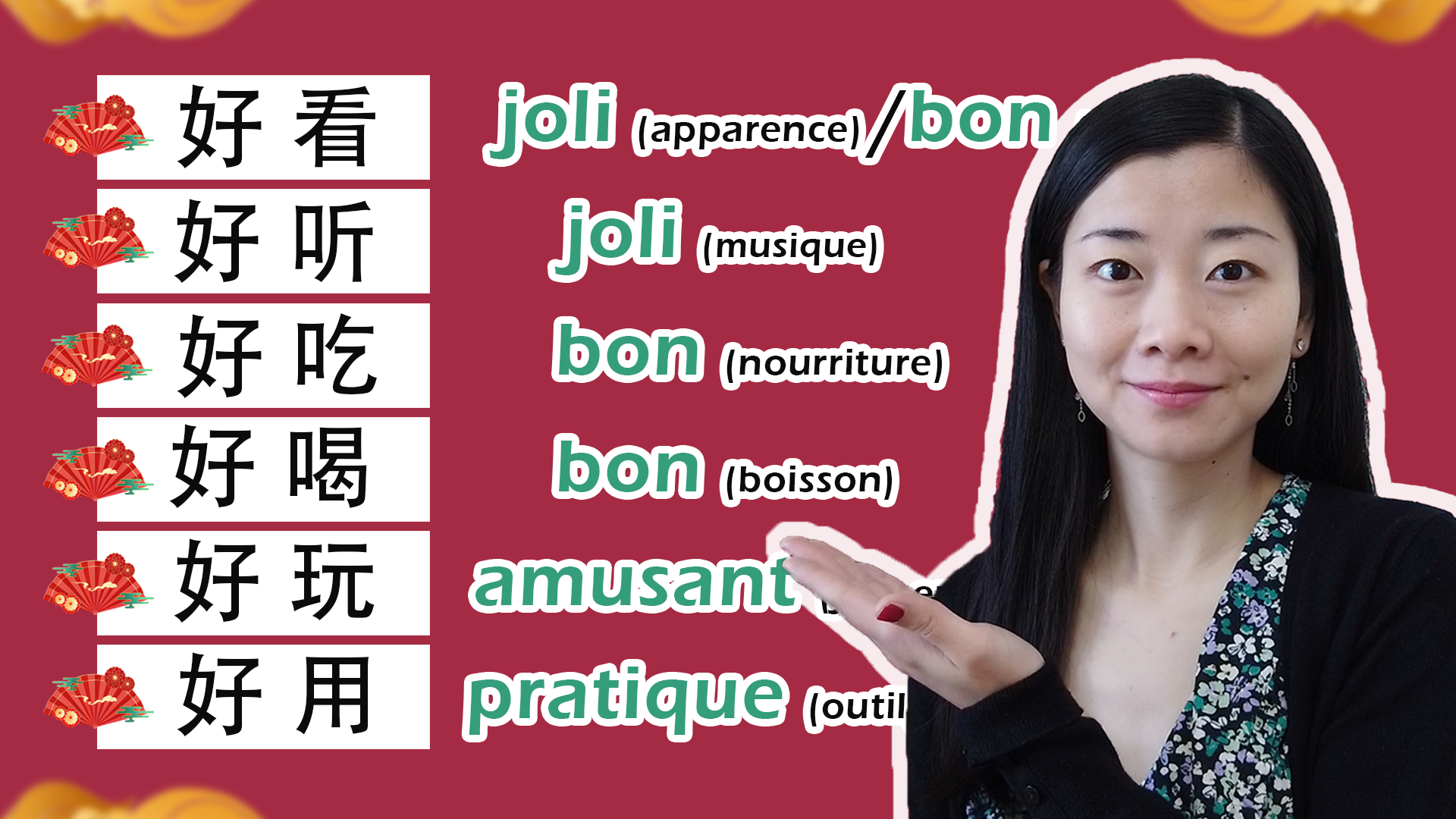 1) Le premier : 好 + 看 (regarder) → joli (pour l’apparence)/bon (pour le contenu)